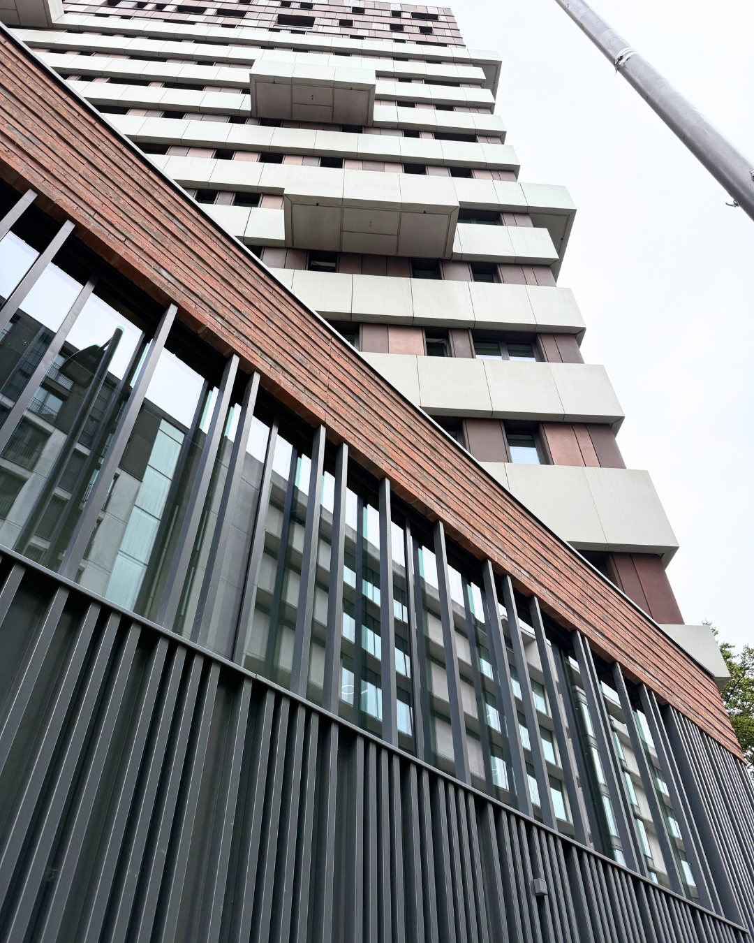 Every component was developed with millimetre-level precision: press-braked, fabricated, painted and assembled in powder coated finishes including Axalta 7021, Interpon Steel Bronze and GRC-look coatings. Together, these elements create the layered, textural character that defines the Kampus elevations, balancing bold geometric forms with refined flat-panel contrasts. Delivered from concept to completion in close collaboration with the project team, the result is a highly crafted architectural envelope that reinforces Kampus’ identity as a landmark city-centre development.