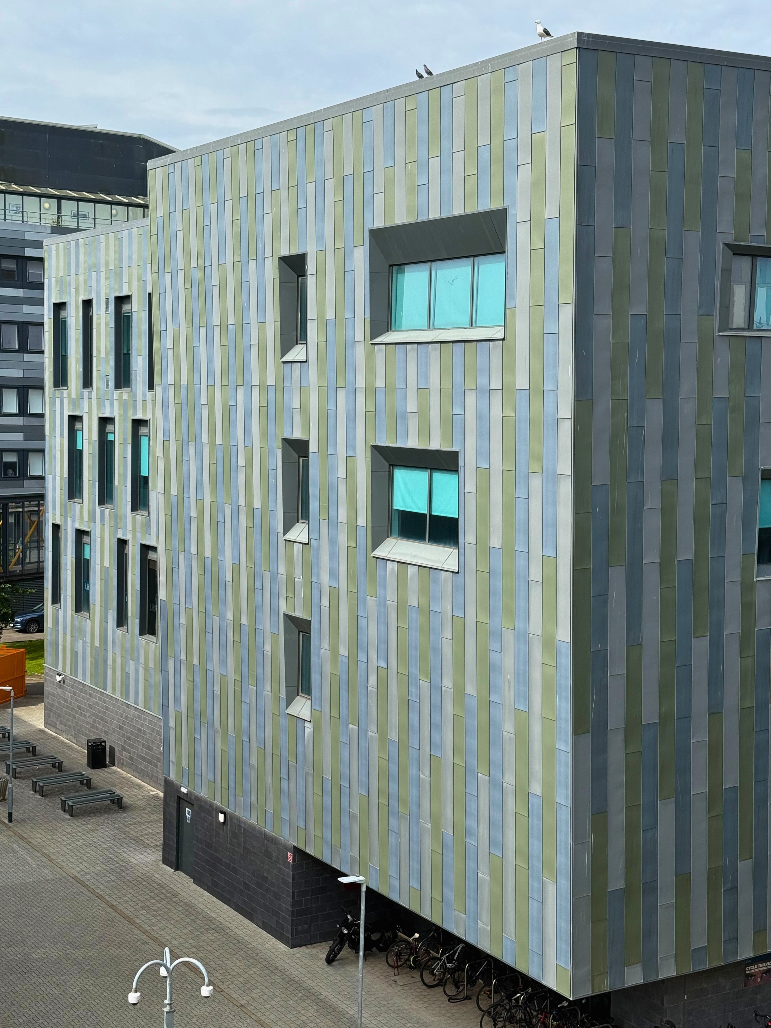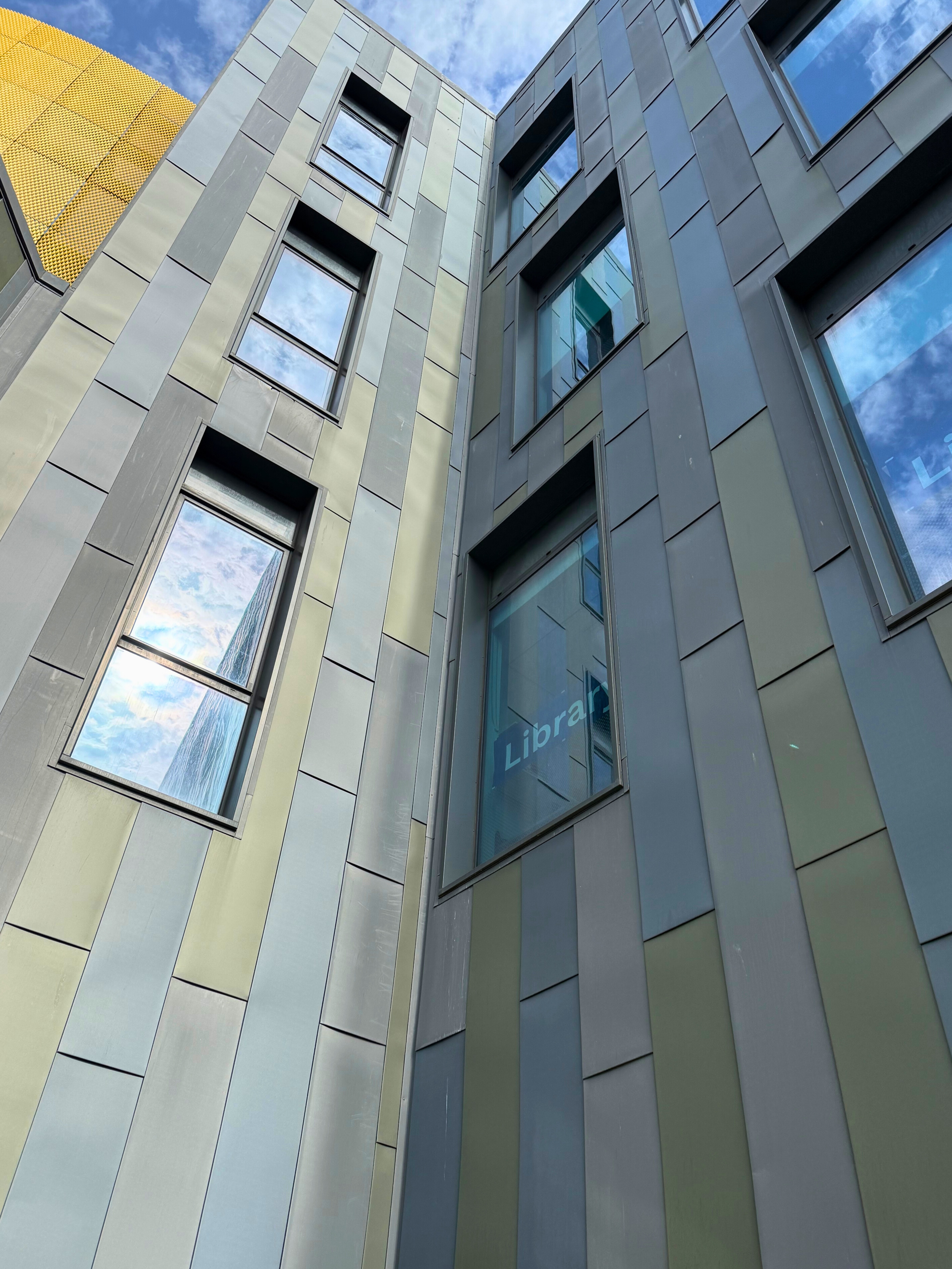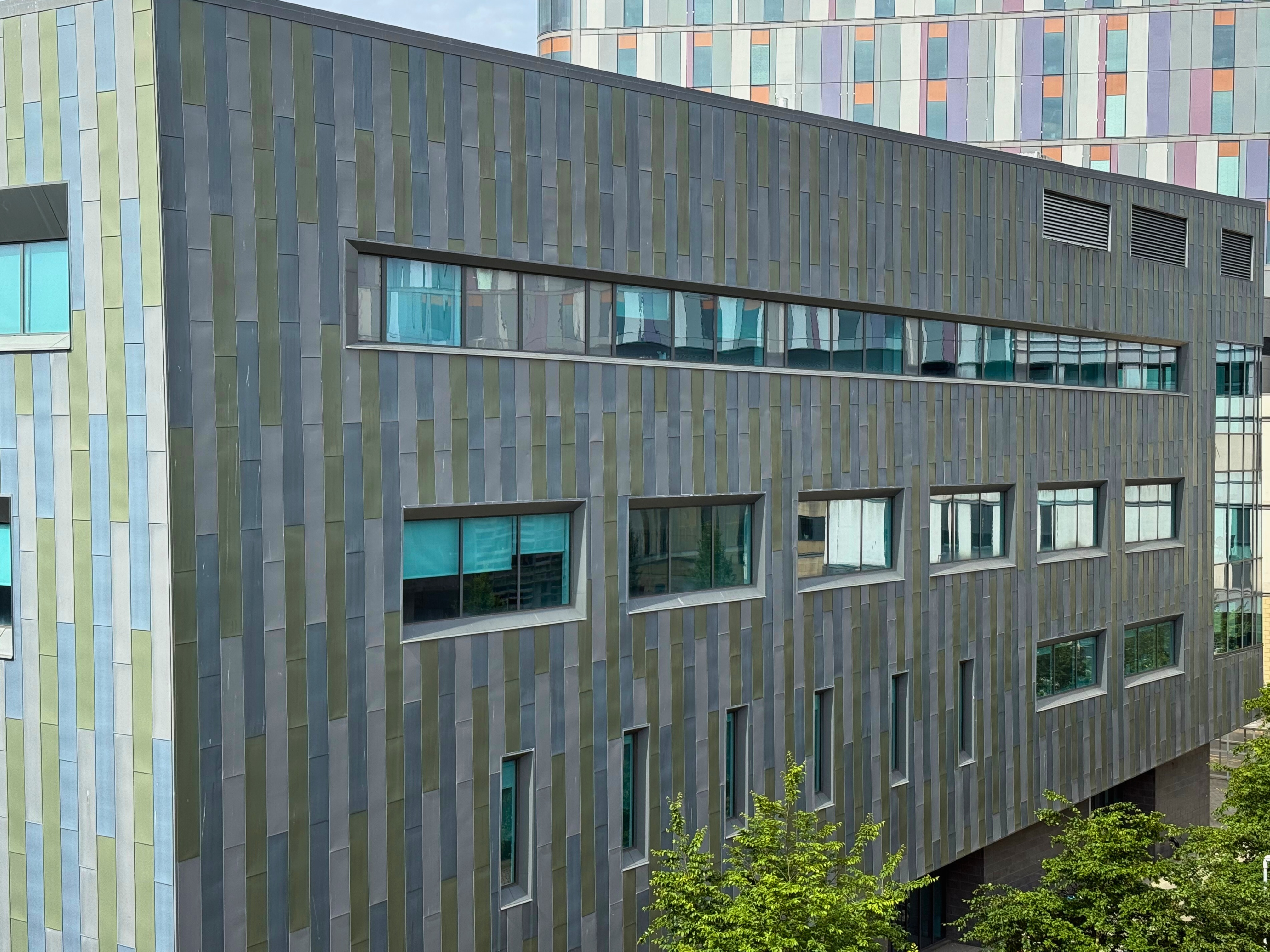A striking façade defined by its distinctive palette of three zinc colours, the Queen Elizabeth Teaching & Learning Centre showcases a refined rectilinear shingle format with carefully executed offset joints. Working alongside the architect and main contractor, we took the design intent and developed the technical approach that made the façade achievable in practice — from the detailing of the shingles to the way each element came together during fabrication.